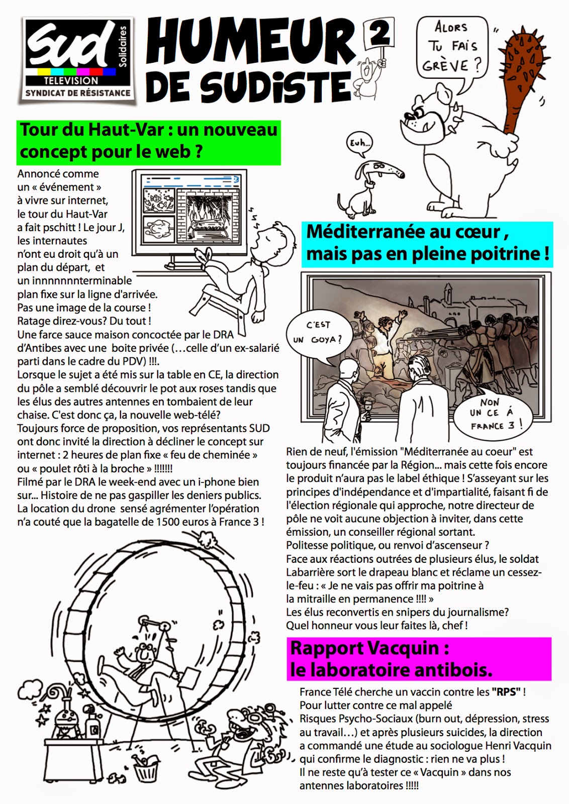 Billet d’humeur du pôle Sud-Est – n°2 15 avril 2015 par Sud Médias Télévision Telecharger ici Partager : Cliquer pour partager sur X(ouvre dans une nouvelle fenêtre) X Cliquez pour partager sur Facebook(ouvre dans une nouvelle fenêtre) Facebook J’aime chargement… Similaire A propos Sud Médias Télévision SUD Médias Télévision, syndicat à vocation nationale, autonome et indépendant, se fixe pour mission de défendre la dignité de chacun dans son travail et de lutter contre la déshumanisation de l’entreprise.