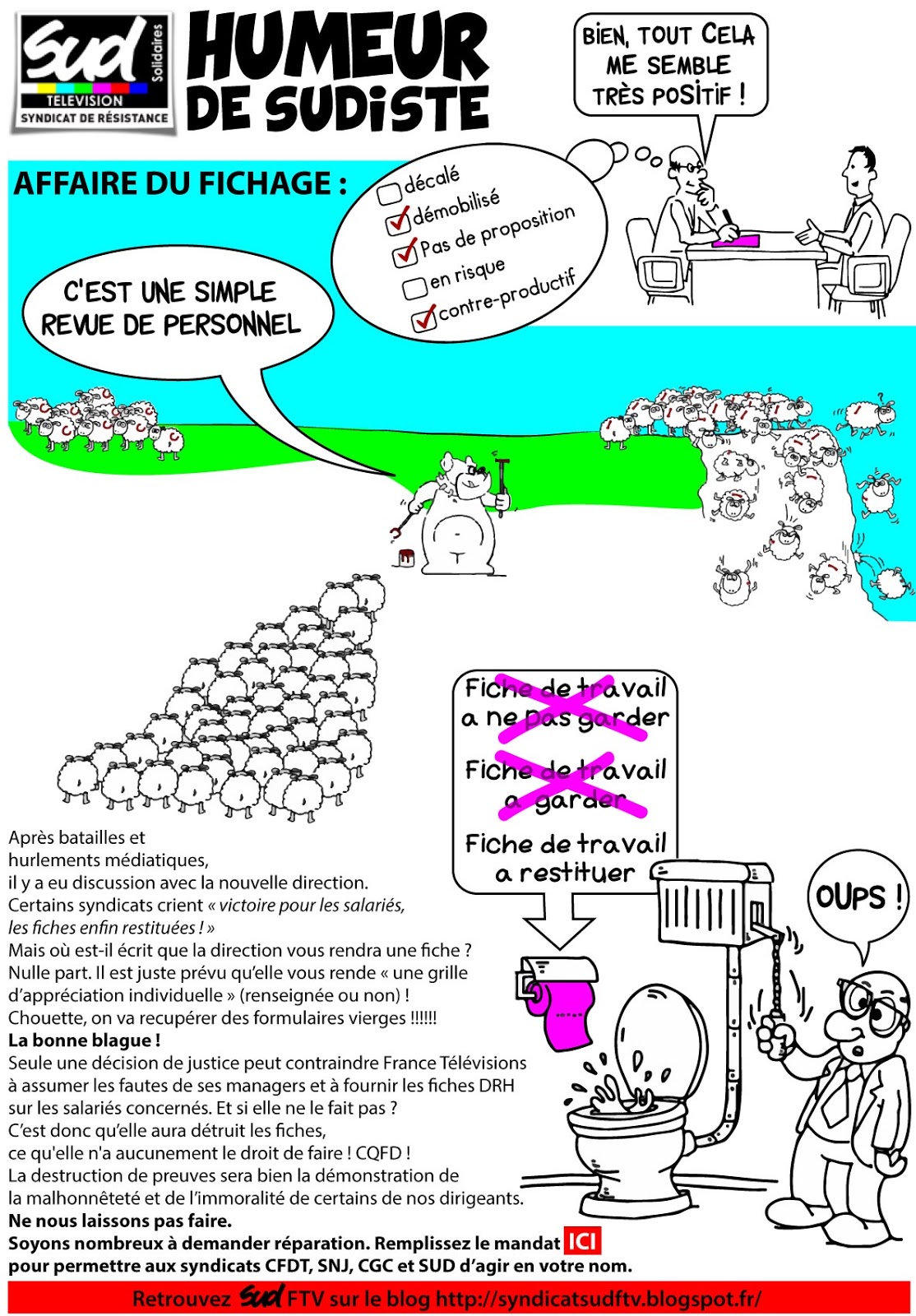 AGIR OU SUBIR, IL FAUT CHOISIR ! 4 novembre 2015 par Sud Médias Télévision Souriez vous êtes fichés ! Partager : Cliquer pour partager sur X(ouvre dans une nouvelle fenêtre) X Cliquez pour partager sur Facebook(ouvre dans une nouvelle fenêtre) Facebook J’aime chargement… Similaire A propos Sud Médias Télévision SUD Médias Télévision, syndicat à vocation nationale, autonome et indépendant, se fixe pour mission de défendre la dignité de chacun dans son travail et de lutter contre la déshumanisation de l’entreprise.